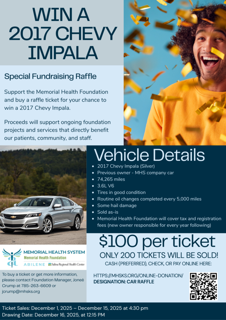 In December 2025, the Memorial Health Foundation hosted a special fundraising raffle featuring a 2017 Chevy Impala. With only 200 tickets available, community members had the opportunity to support local healthcare initiatives while entering for the chance to win a well-maintained Memorial Health System company vehicle.